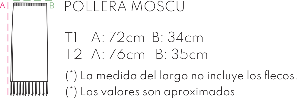 Pollera larga tejida (calada) con flecos y lazo para ajustar en cintura.