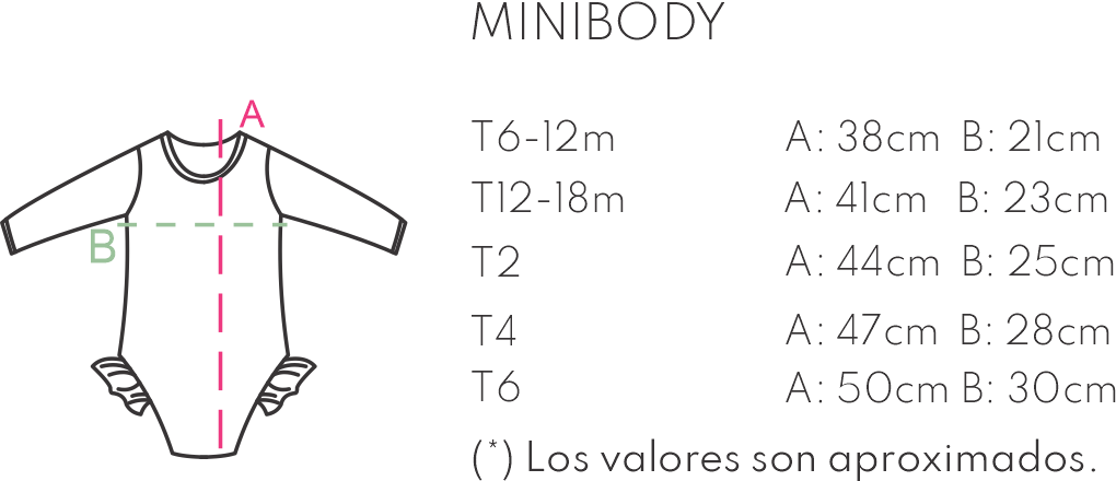 Nuestro mini body viene con mangas largas, botones pañaleros por debajo y lazo en la espalda para mejor agarre.