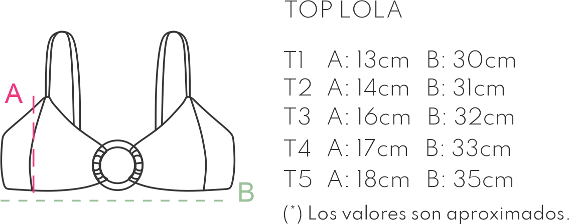 El corpiño Lola es de los más elegidos y de mejor agarre. Top con delantera unida por una argolla de resina, la cual le da estructura al mismo. Recomendado para sostener y contener en todo los talles. Los breteles son regulables y se ata en espalda. No tiene espacio para almohaditas (costuras embolsadas).
