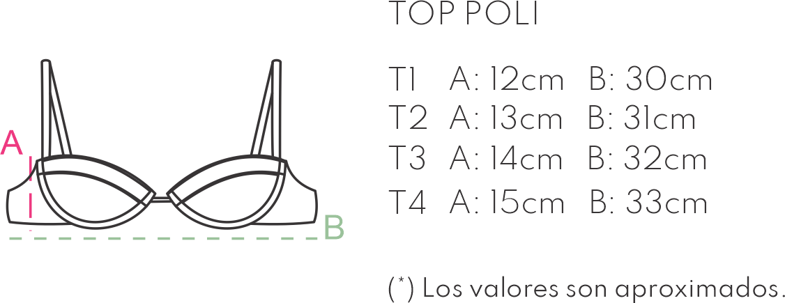 El top Poli es un corpiño de corte bajo con aro, bretel regulable y broche mariposa en la espalda.